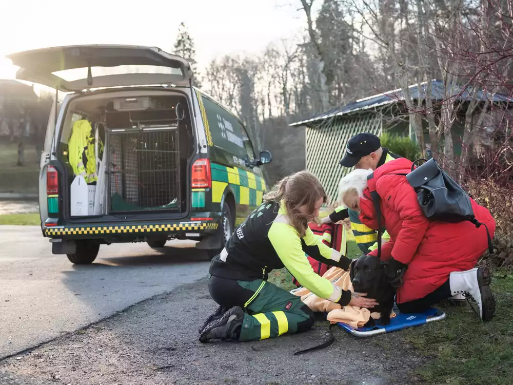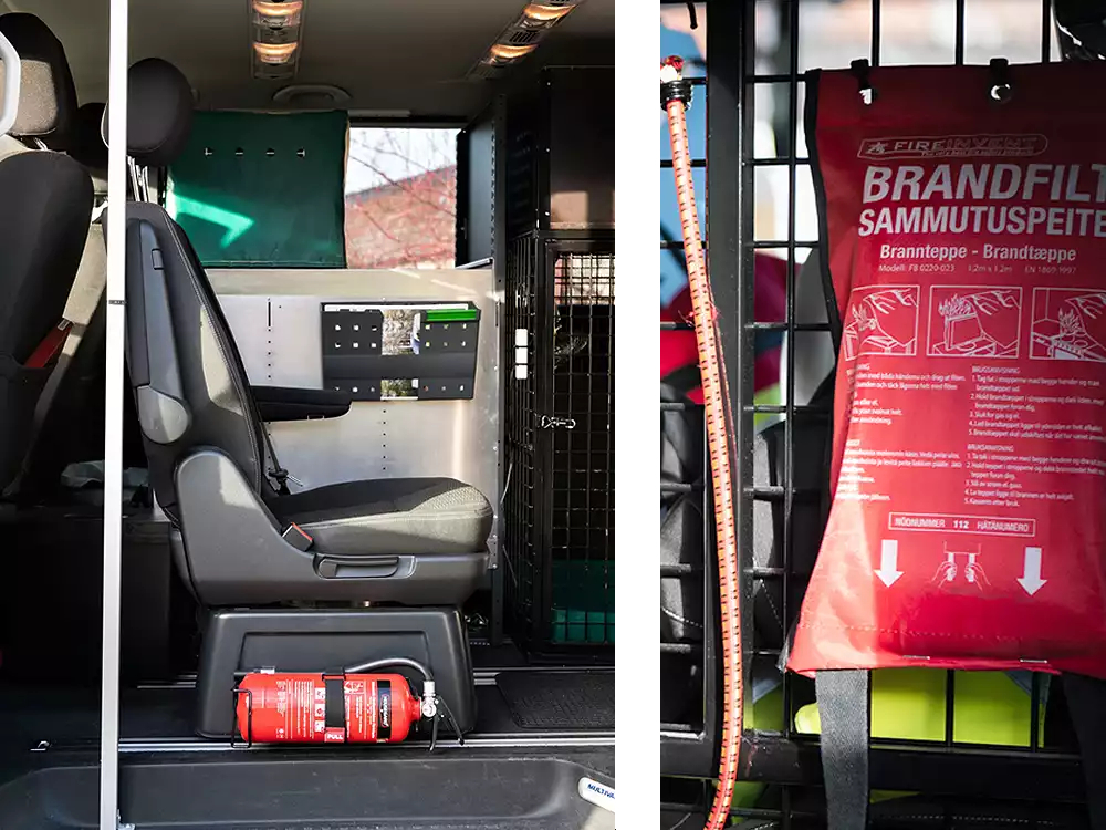 Bak i bilen har vi en stor, specialbyggd hundbur som går att dela i två utrymmen. Här finns även ramp, bår, akutväska, viltkartonger och annan nödvändig utrustning som behövs i vårt arbete.
