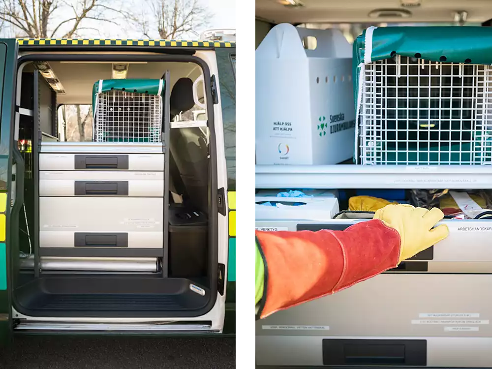 I skåpet, på djurambulansens högra sida, finns kattbur och förvaringslådor med förbrukningsmateriel och utrustning. Alltifrån verktyg och skyddsutrustning till städ- och hygienartiklar.